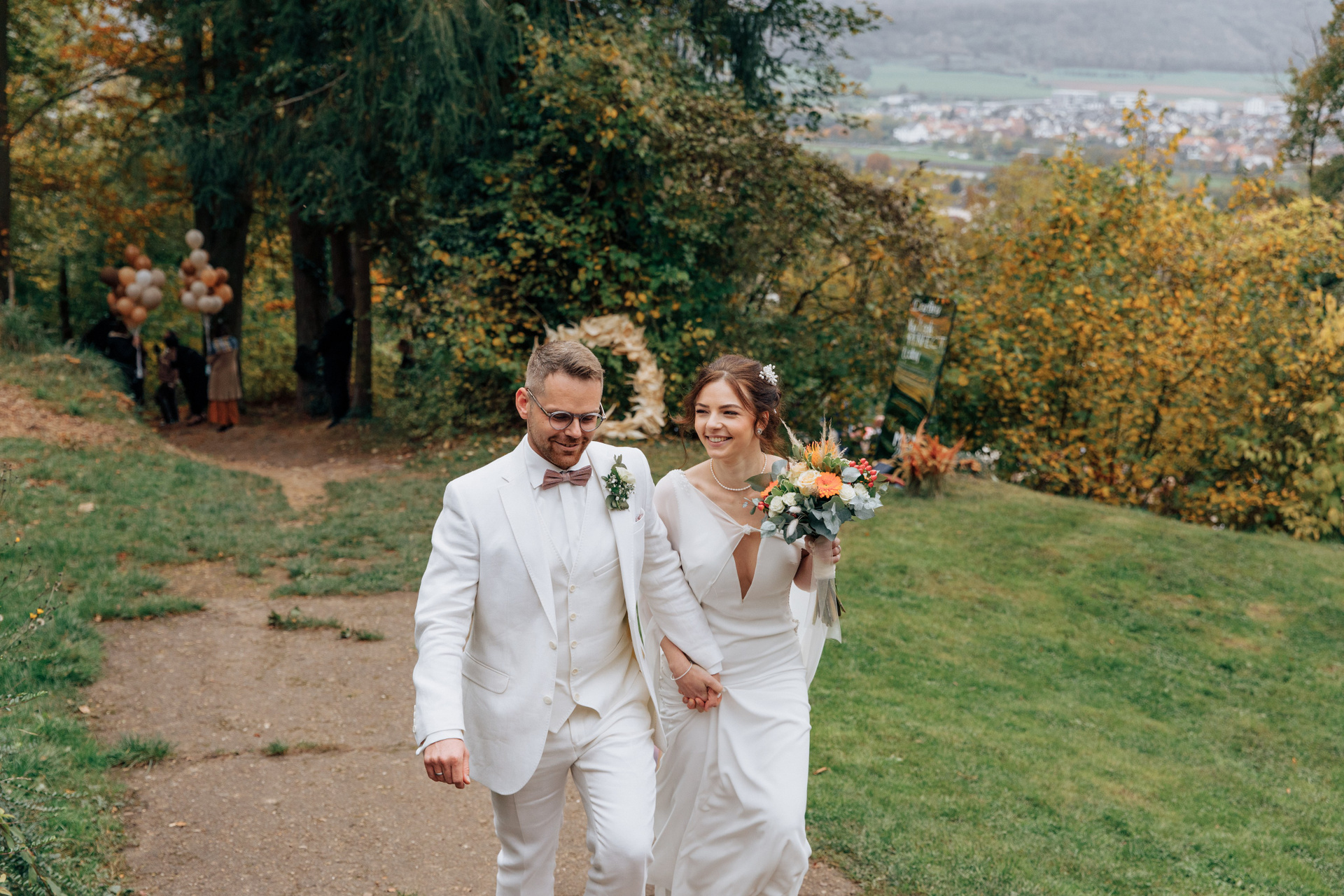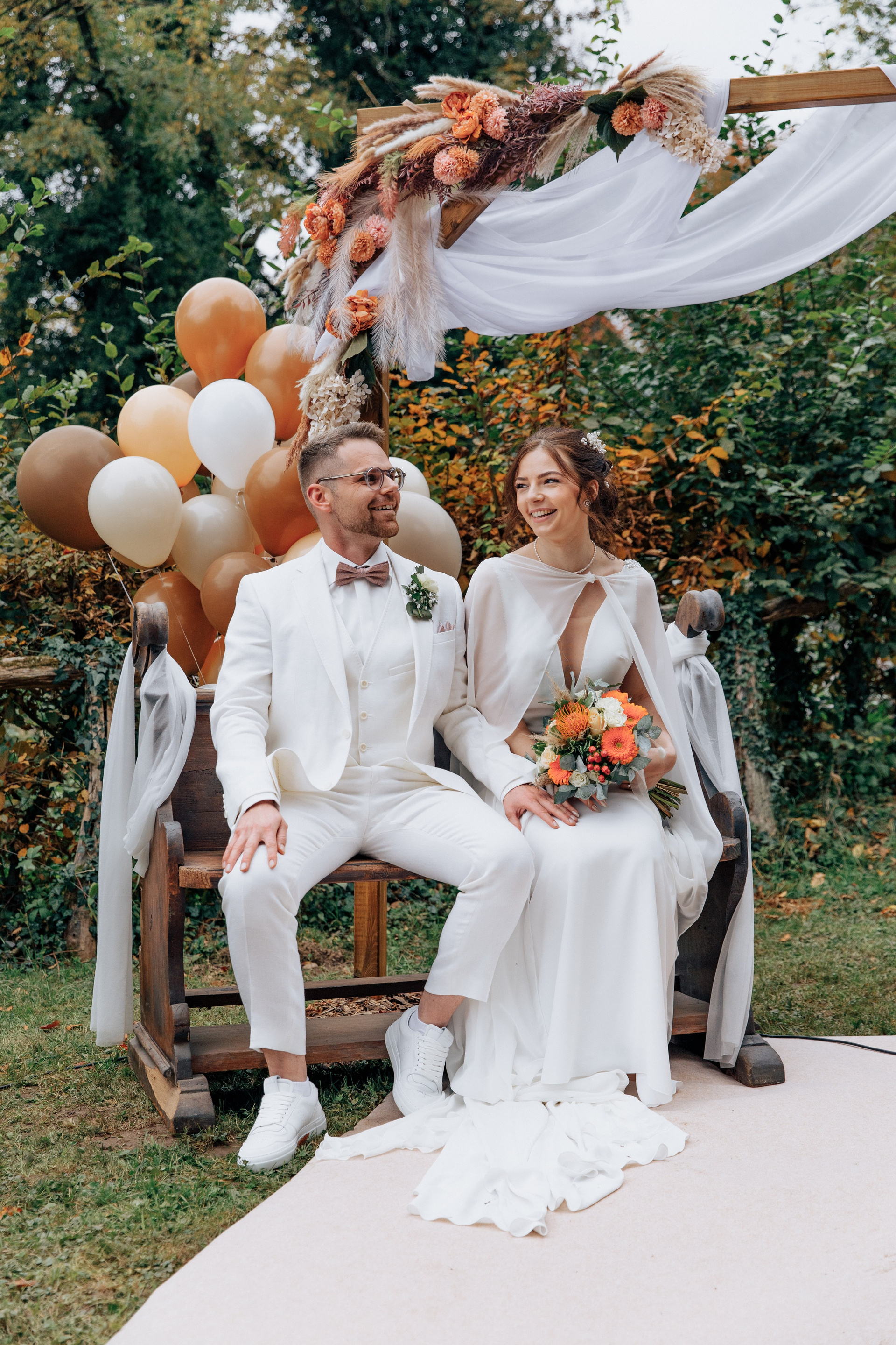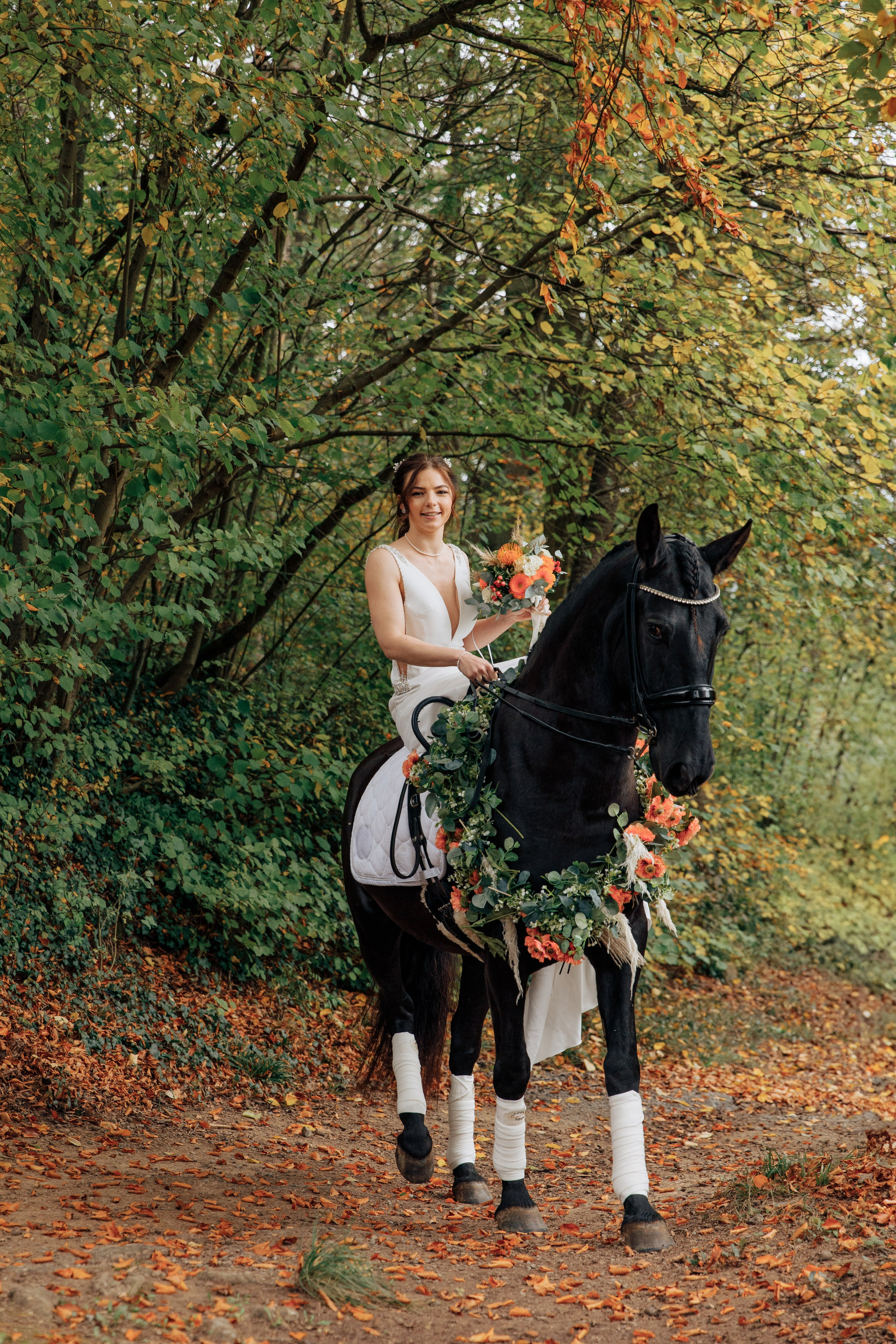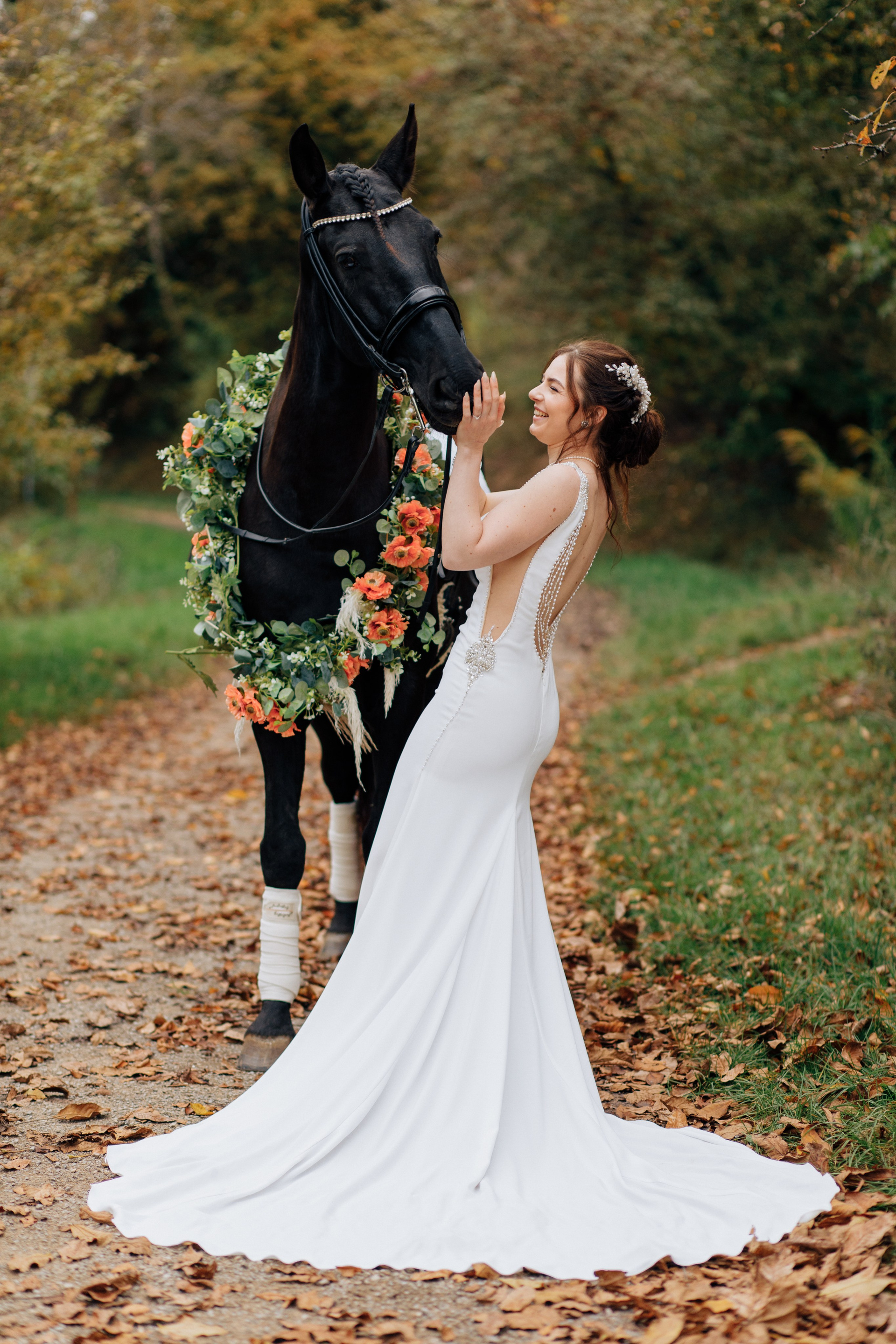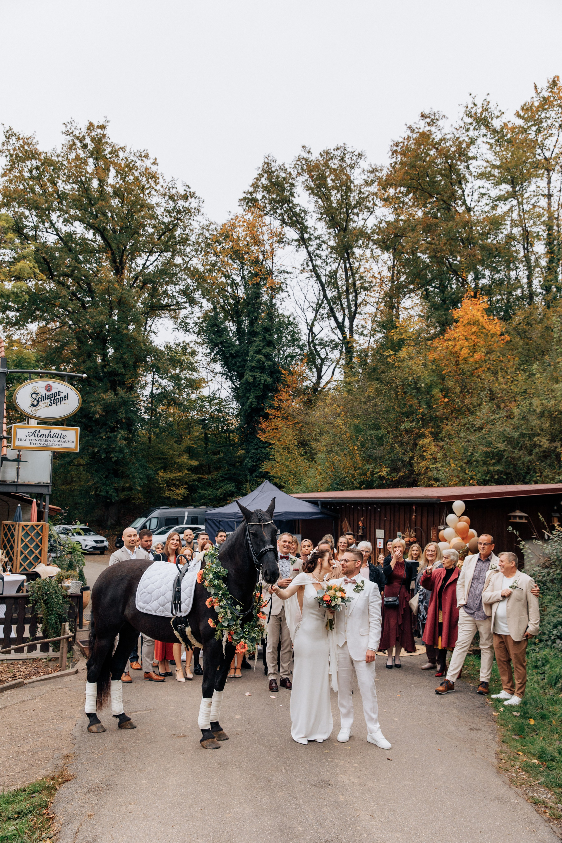 Es war eine kleine familiäre Hochzeit an einem warmen Oktobertag, umgeben von der bunten Herbstlandschaft mit Blick auf Kleinwallstadt. Ein besonderes Highlight war der Auftritt der Braut auf einem Pferd, gefolgt von einem einzigartigen Fotoshooting mit dem Tier. Alles war wunderschön dekoriert, die Atmosphäre war entspannt und fröhlich – und das Brautpaar strahlte vor Glück!