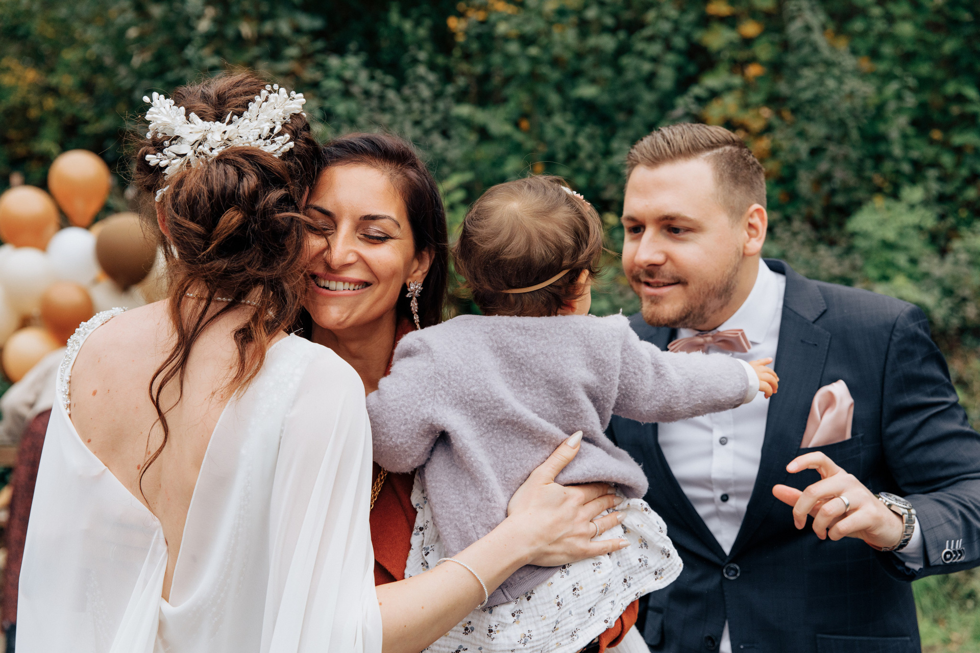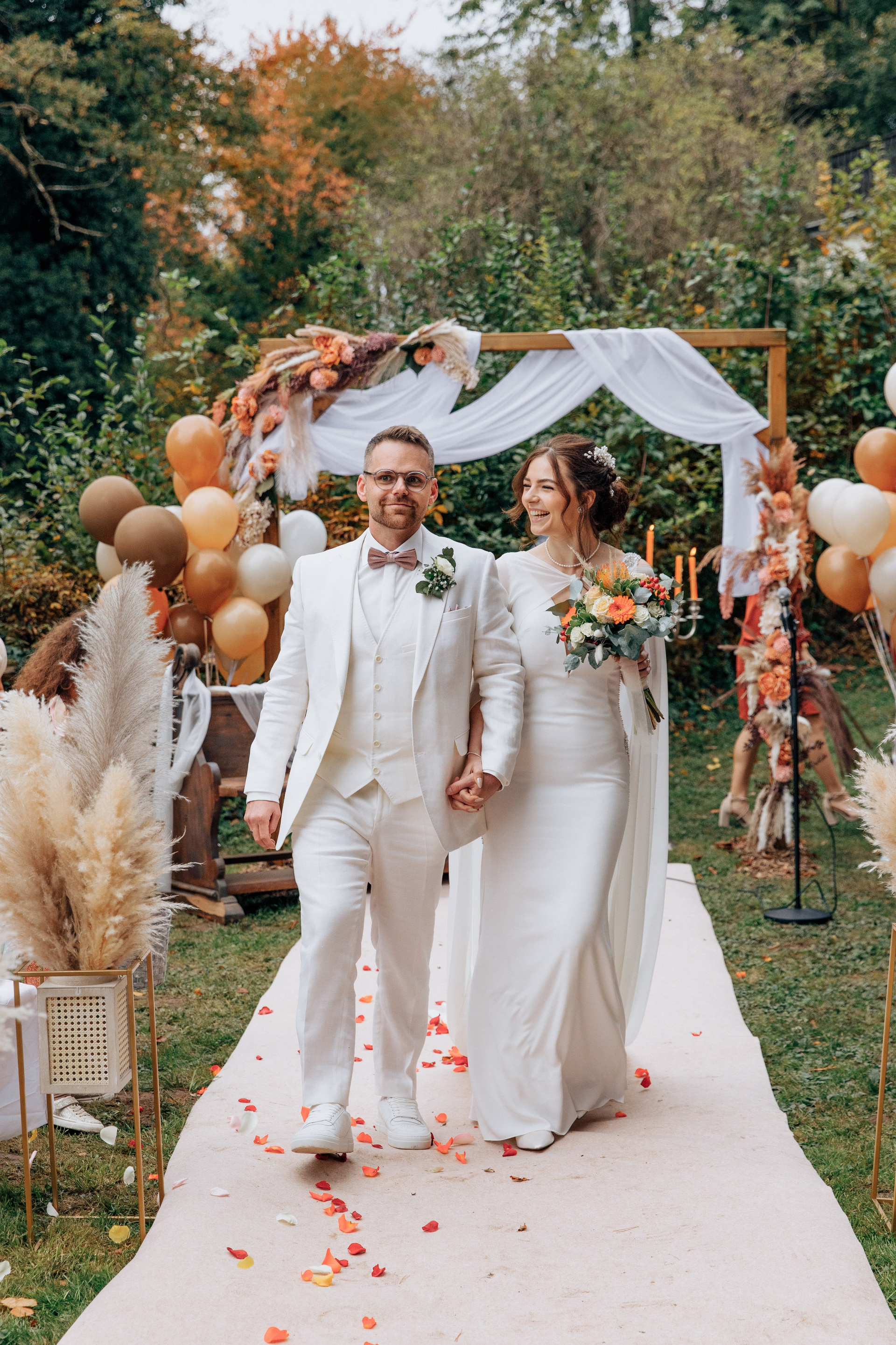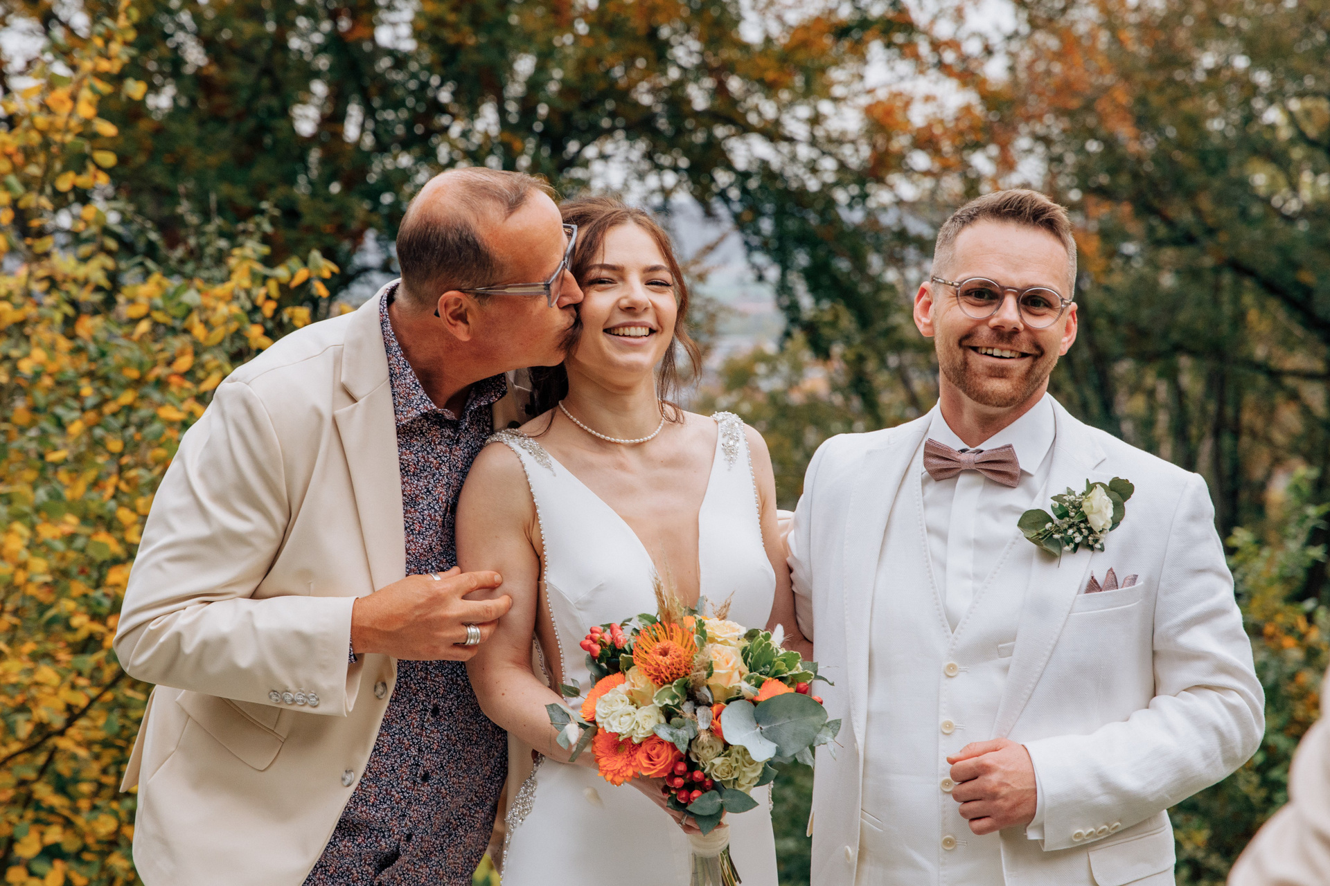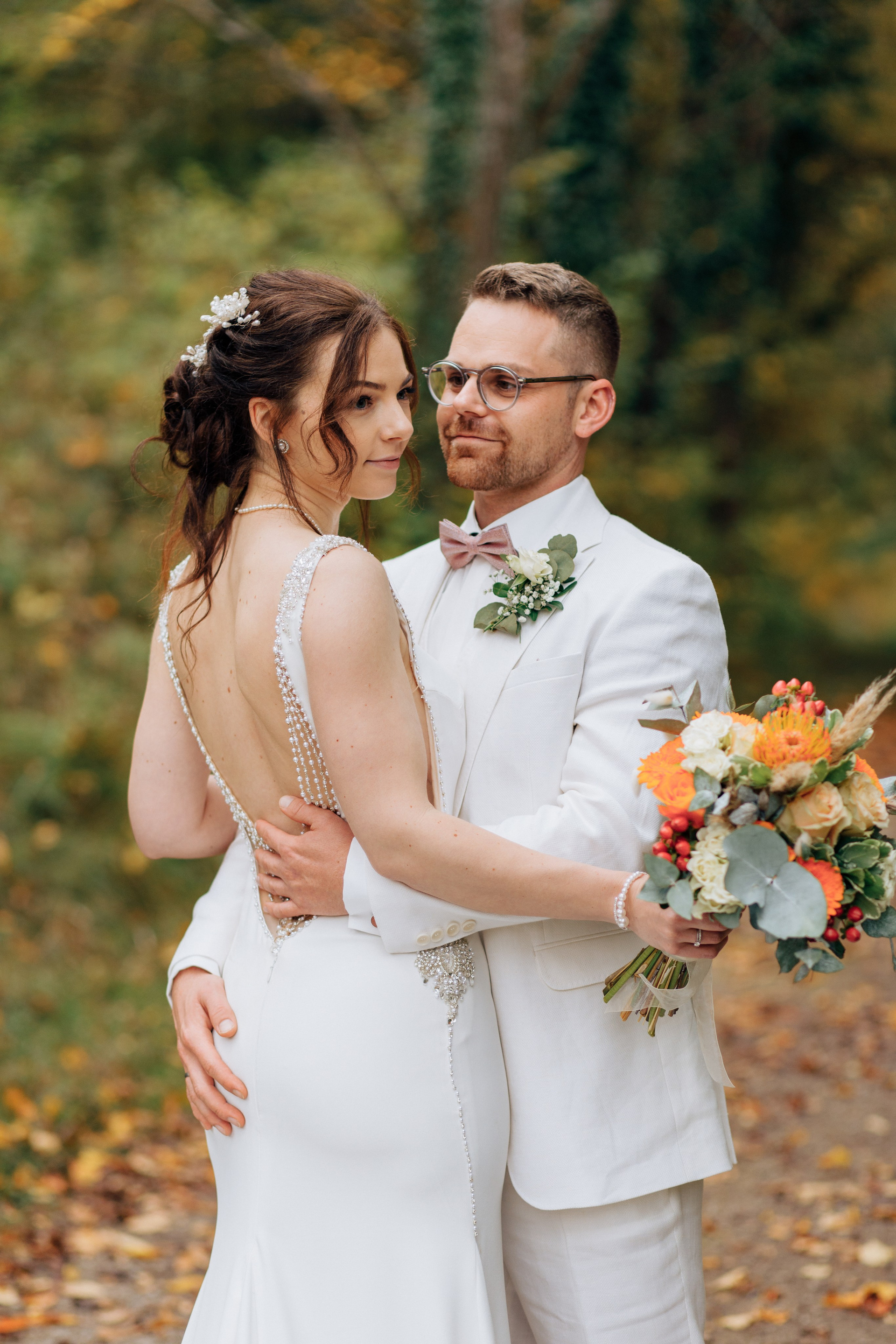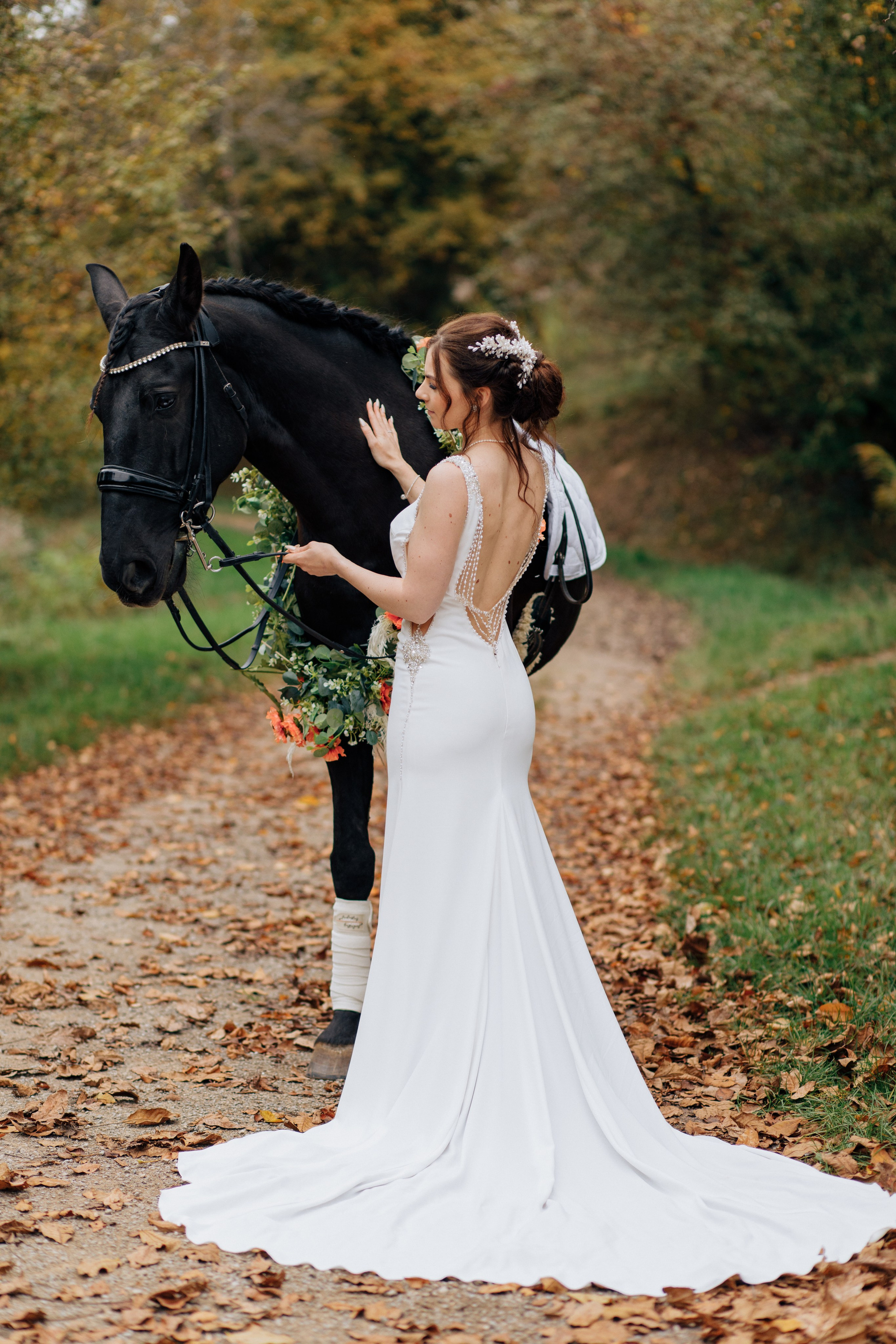Es war eine kleine familiäre Hochzeit an einem warmen Oktobertag, umgeben von der bunten Herbstlandschaft mit Blick auf Kleinwallstadt. Ein besonderes Highlight war der Auftritt der Braut auf einem Pferd, gefolgt von einem einzigartigen Fotoshooting mit dem Tier. Alles war wunderschön dekoriert, die Atmosphäre war entspannt und fröhlich – und das Brautpaar strahlte vor Glück!