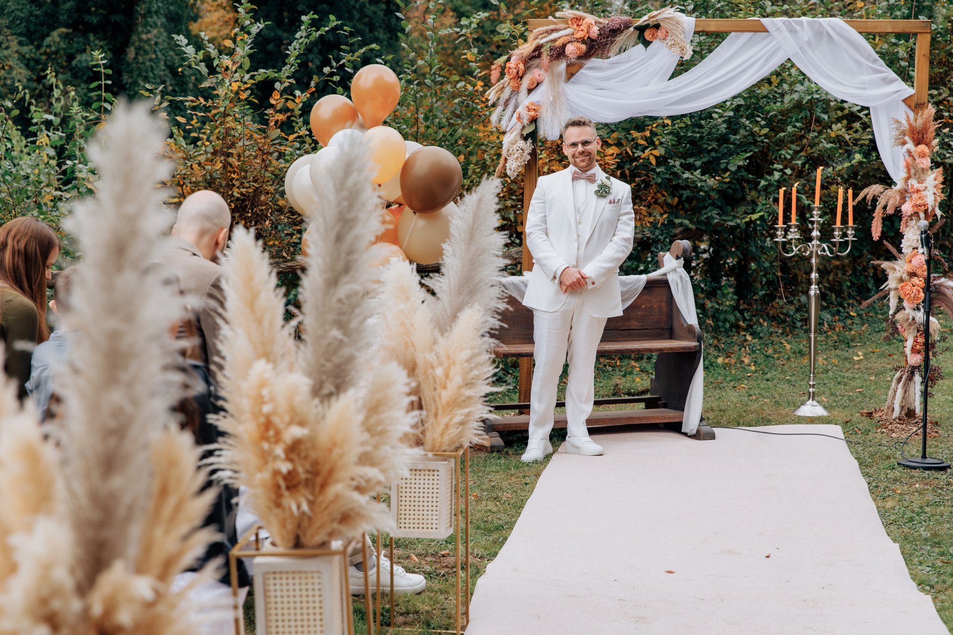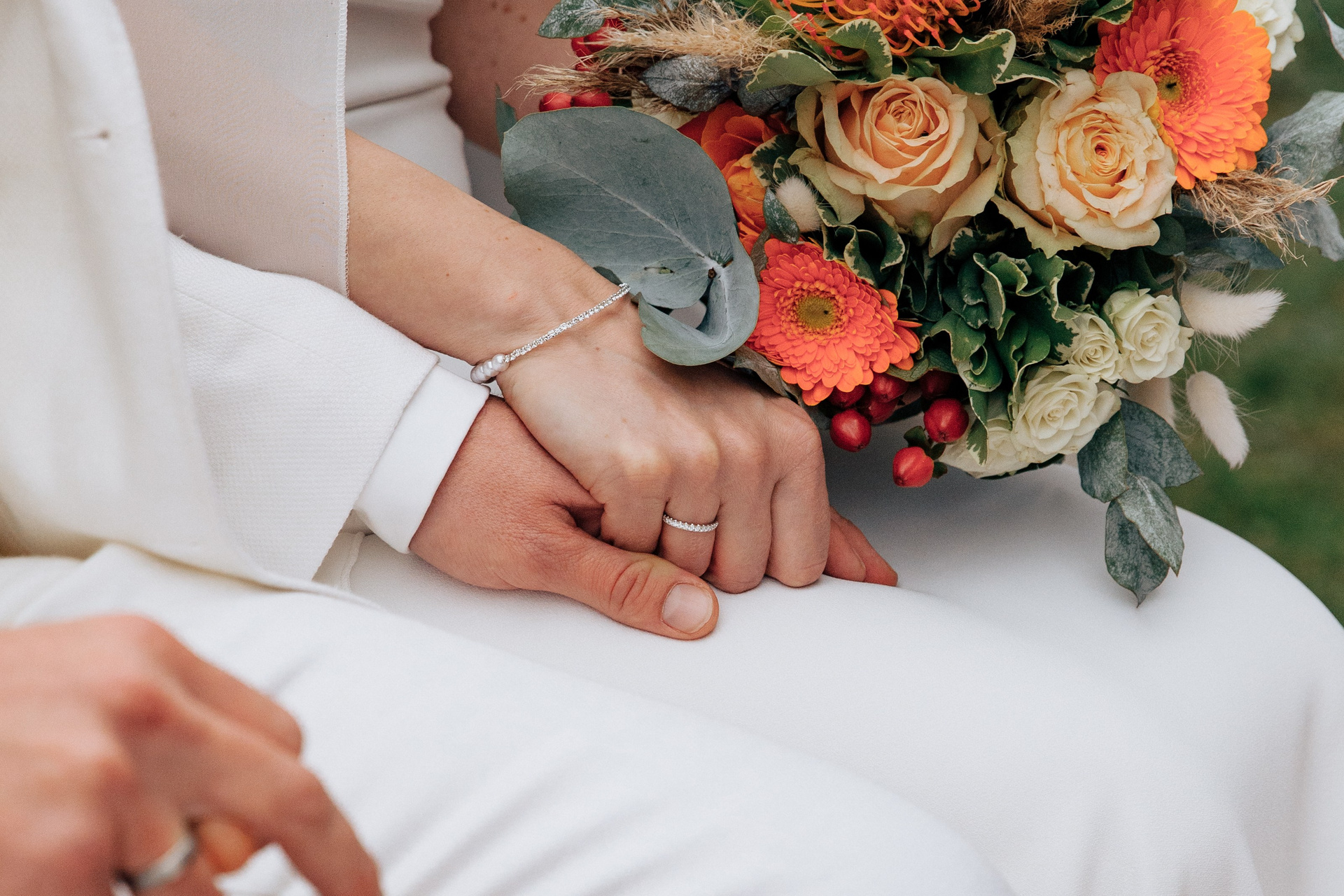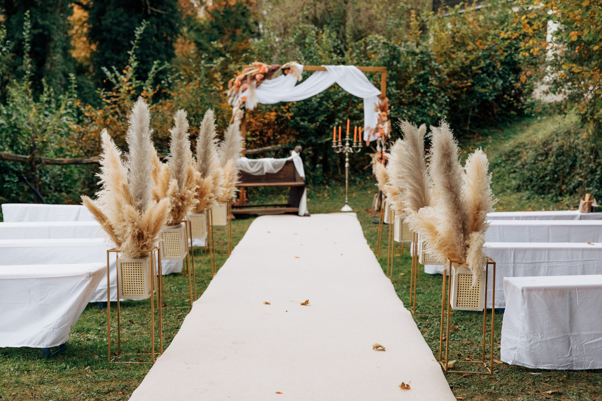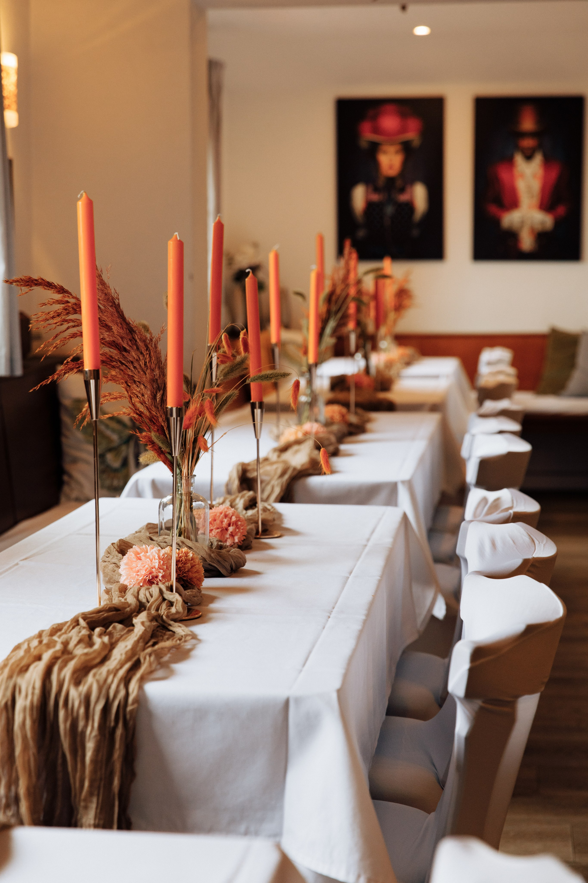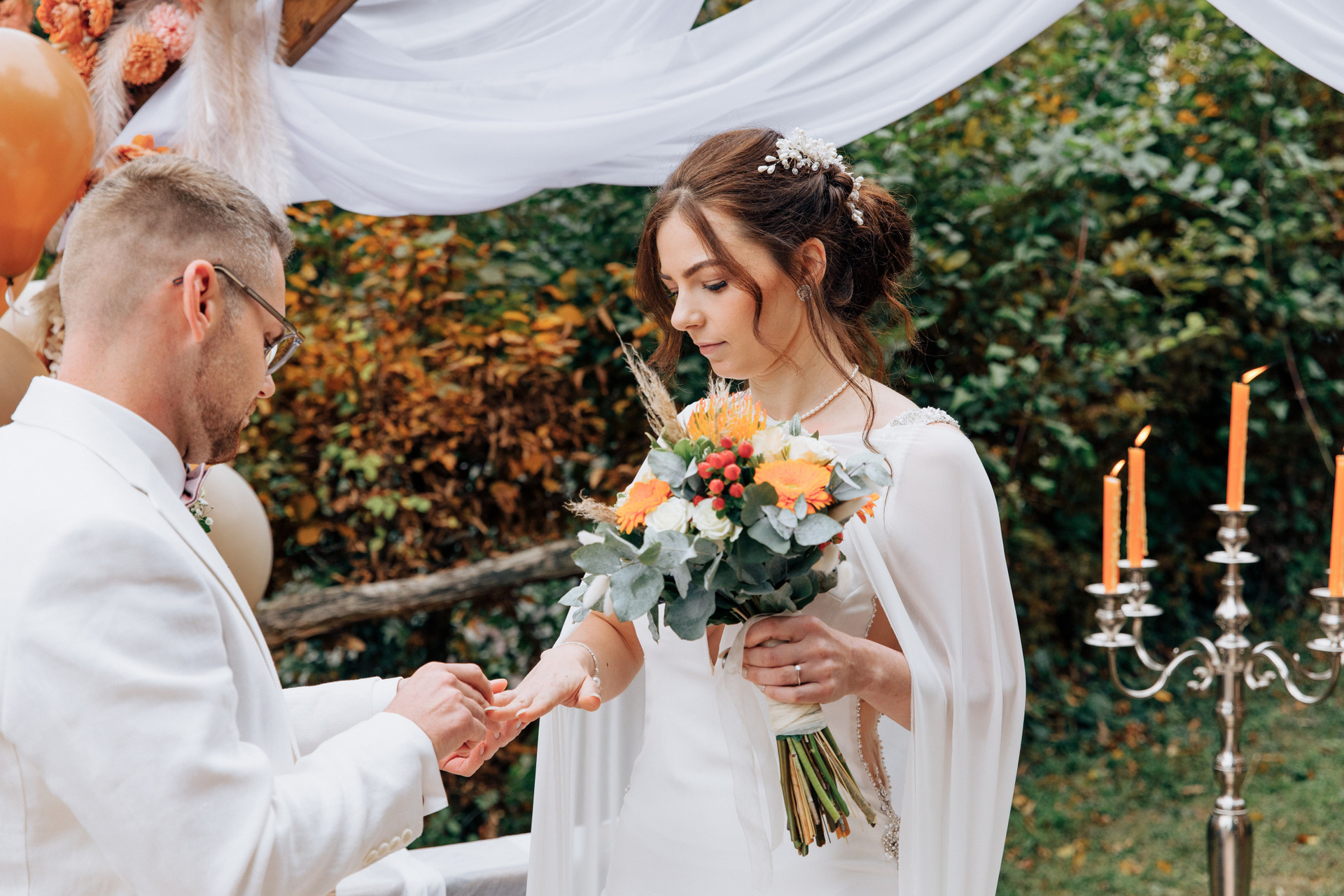 Es war eine kleine familiäre Hochzeit an einem warmen Oktobertag, umgeben von der bunten Herbstlandschaft mit Blick auf Kleinwallstadt. Ein besonderes Highlight war der Auftritt der Braut auf einem Pferd, gefolgt von einem einzigartigen Fotoshooting mit dem Tier. Alles war wunderschön dekoriert, die Atmosphäre war entspannt und fröhlich – und das Brautpaar strahlte vor Glück!